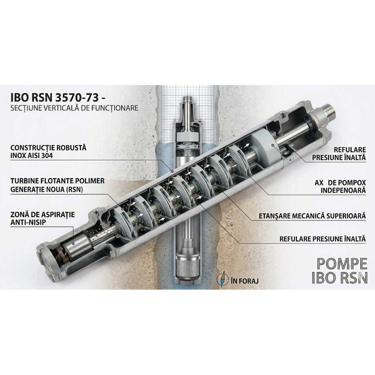 Ai investit într-un foraj și te temi că nisipul fin îți va distruge pompa? IBO RSN 3570-73 este alegerea strategică pentru liniștea ta. Acest model hibrid, cu un diametru compact de 3.5 inch (89 mm) , este special conceput pentru a face față forajelor dificile, chiar și acolo unde alte pompe s-au blocat sau s-au folosit prematur.