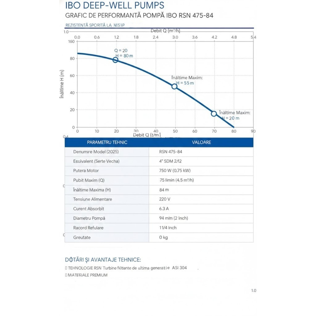 Pompa IBO RSN 475-84 este proiectată cu Rezistență Sporită la Nisip pentru a face față unor condiții de lucru dificile. Cu toate acestea, trebuie să știți că deteriorarea turbinelor și a componentelor cauzată de vehicularea nisipului NU face obiectul garanției.